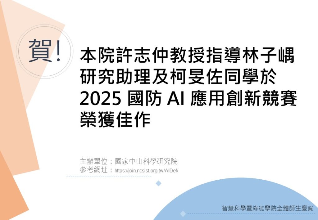 蔡 2025 年 12 月 18 日2025 年 12 月 18 日 SDG11, SDG9, 最新消息, 獲獎捷報 賀!本院許志仲教授指導林子嵎研究助理及柯旻佐同學於2025 國防 AI 應用創新競賽榮獲佳作