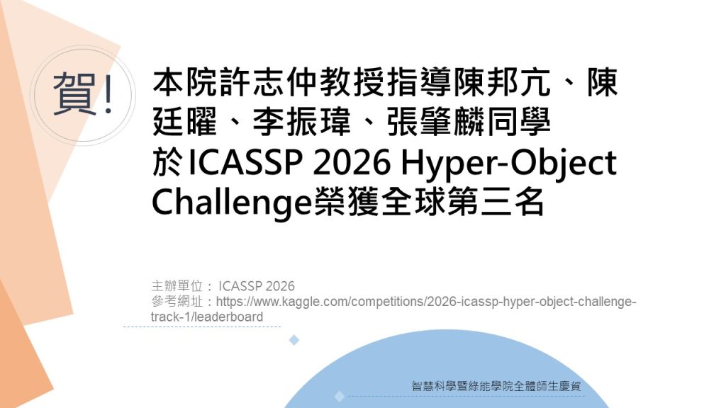 蔡 2026 年 1 月 16 日 SDG11, SDG9, 最新消息, 獲獎捷報 賀!本院許志仲教授指導陳邦亢、陳廷曜、李振瑋、張肇麟同學於 ICASSP 2026 Hyper-Object Challenge榮獲全球第三名