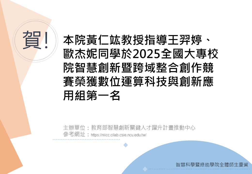 蔡 2025 年 10 月 22 日 SDG11, SDG9, 最新消息, 獲獎捷報 賀!本院黃仁竑教授指導王羿婷、歐杰妮同學於2025全國大專校院智慧創新暨跨域整合創作競賽榮獲數位運算科技與創新應用組第一名